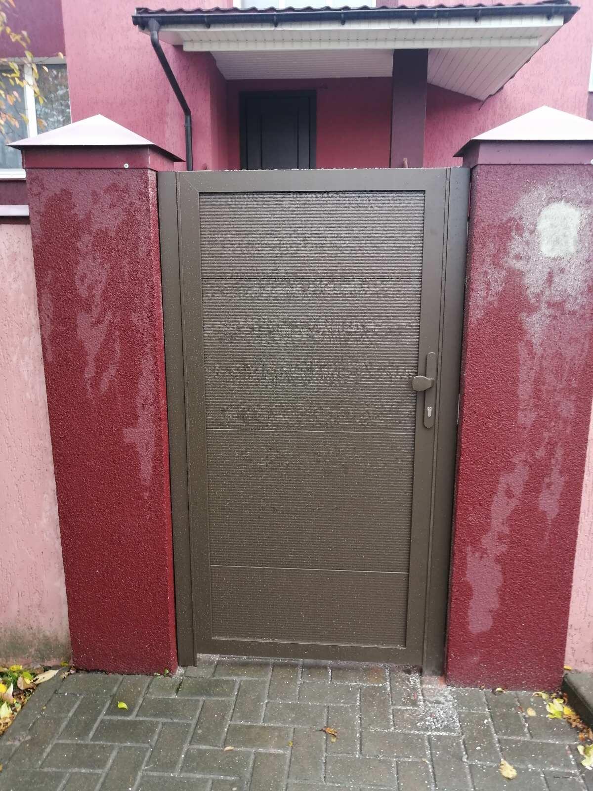 На фото представлены алюминиевая откатные ворота, выполненные в цвете RAL8017 Шоколадный с текстурой микроволна. Заполнение ворот и калитки изготовлено из прочных и износостойких сэндвич-панелей.