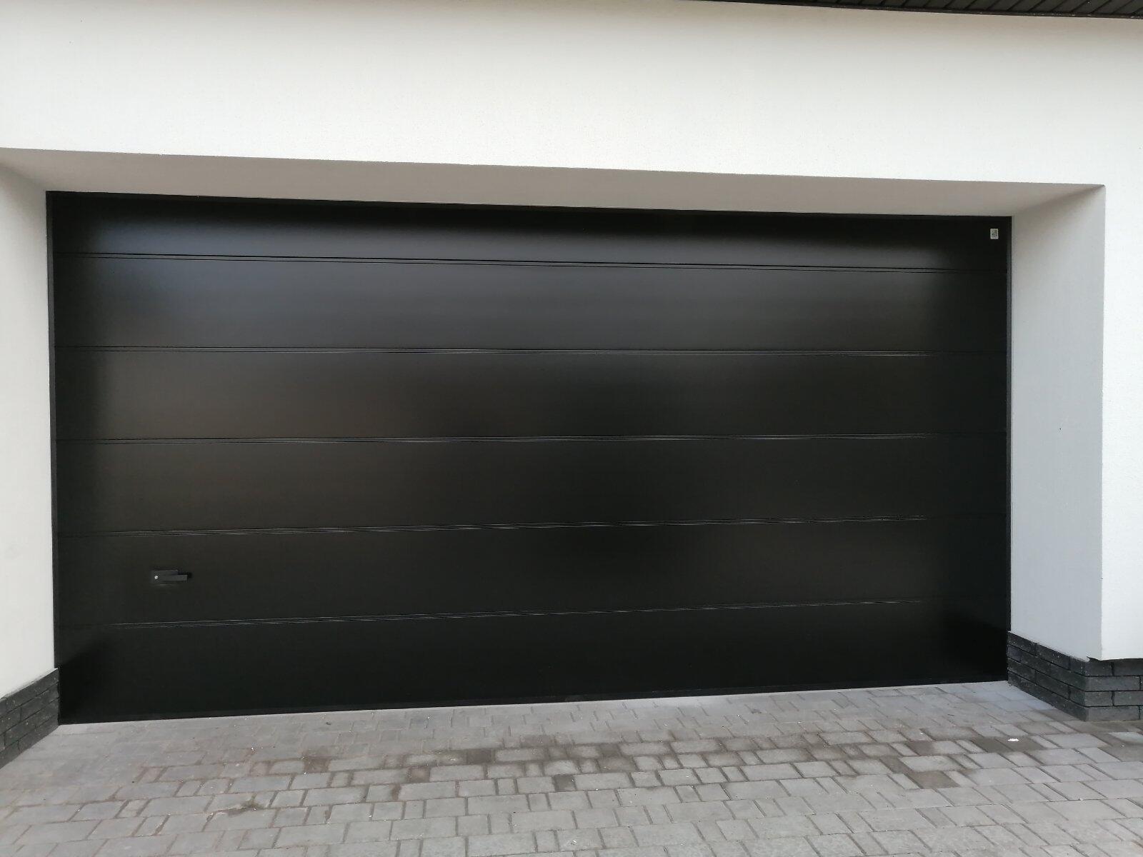 На фото представлены гаражные секционные ворота, выполненные в Черном цвете. Полотно ворот изготовлено из прочных и износостойких сэндвич-панелей.